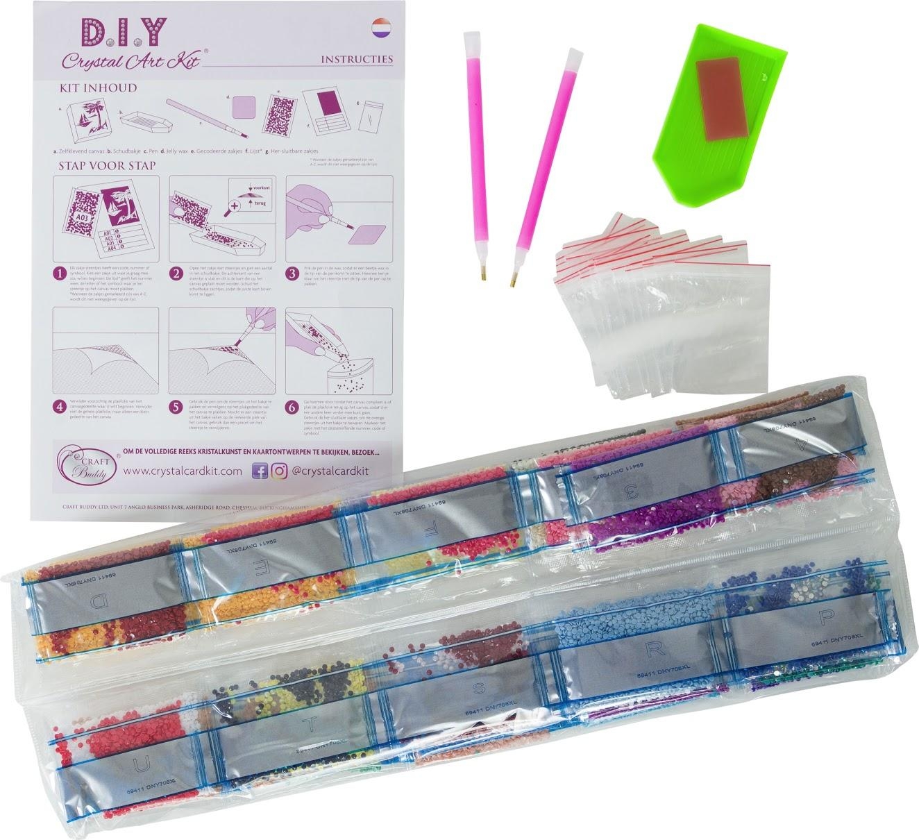 Onze Diamond Painting pakketten van Crystal Art worden geleverd met een voorbedrukte en voorgespannen canvas doek op een houten frame, voorgesorteerde gekleurde steentjes in aparte zakjes, een werkpen, een blokje wax, duidelijke instructies en een sorteerbakje. Het canvas doek is voorbedrukt met speciale lijm en voorzien van een beschermende folie.